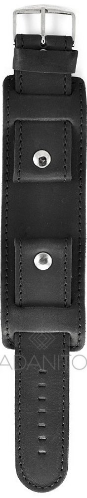 Univerzální kožený řemínek na hodinky s podložkou má šířku 28 mm, černou barvu a stříbrnou přezku. Řemínek je prošitý černou nití. Rozměr podložky je 138 x 42 mm. Délka části řemínku s přezkou je 90 mm a délka části s dírkami je 125 mm. Tloušťka řemínku je 2,5 mm a je vyroben na Slovensku.