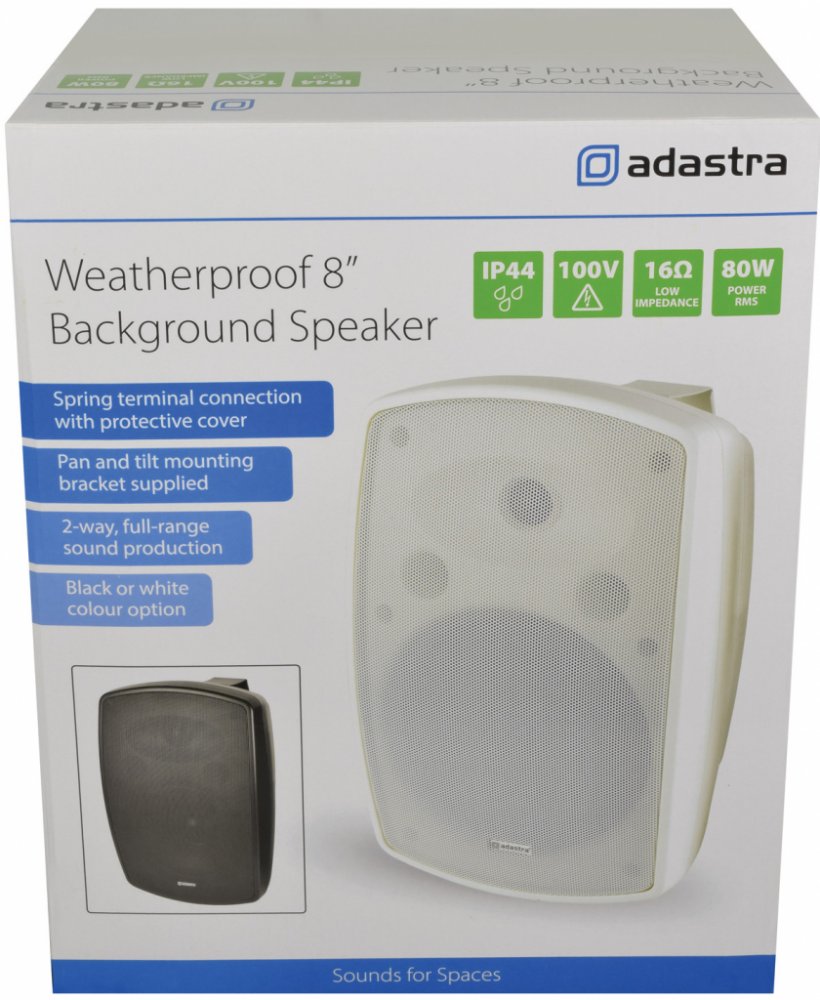 Vysoce kvalitní reproduktor Adastra nabízí krytí IP44, díky kterému je přístroj odolný proti povětrnostním vlivům. Výkonný výškový reproduktor umístěný v kvalitně zpracované skříni s nastavitelnou konzolou pro efektivní přizpůsobení polohy reproduktoru. Navrženo pro vnitřní ale i venkovní hudební pozadí a aplikace pro veřejný rozhlas.