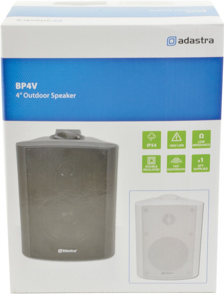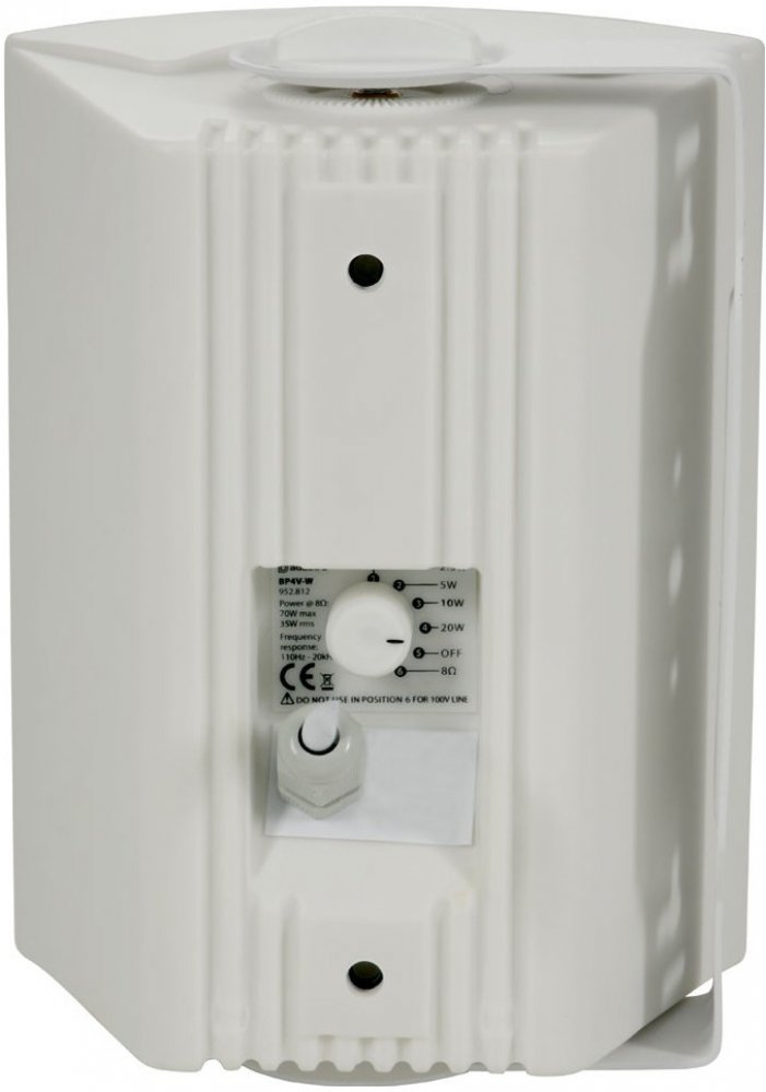 Voděodolný reproduktor s krytím IP54 (vhodné k bazénů či do koupelen). Otočný přepínač pro odběr vedení 100 V nebo provoz 8 Ohmů. Součástí dodávky je držák na zeď. Alternativní upevňovací body se závitem M6. Dodáváno jednotlivě.