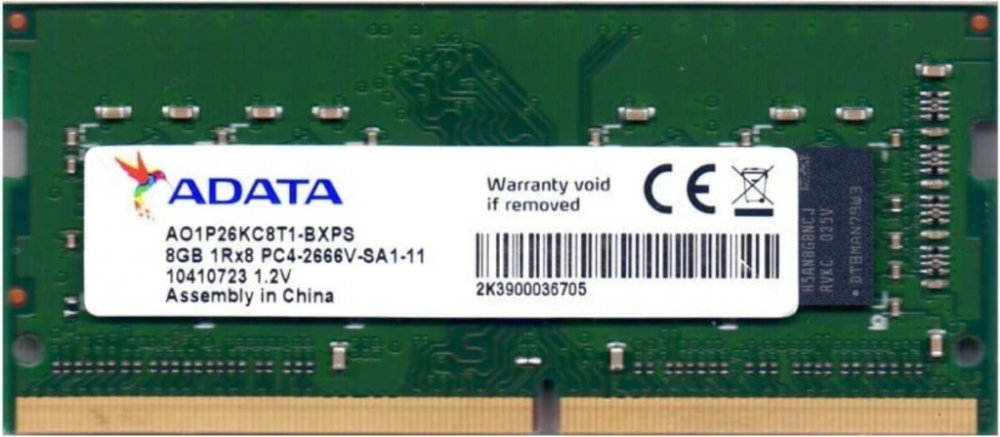 Model: ADATA SODIMM DDR4 8GB 1Rx8 PC4-2666V-SA1-11 2666MHz CL19 AO1P26KC8T1-BXPS