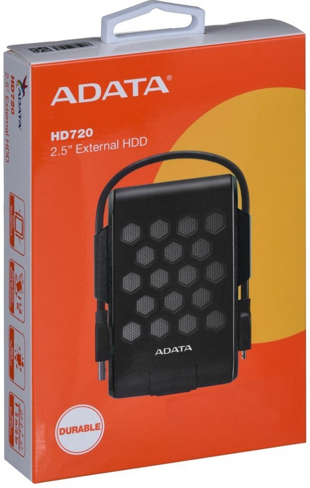HD720 External Hard Drive - LIFE IS AN ADVENTURE HD720 is the ultra durable external hard drive with a sporty design. It features a large storage capacity, and also undergoes stringent tests for waterproofing, dustproofing and shock resistance to provide excellent protection of data. The ADATA HD720 1TB/2TB External Hard Drive is the most rugged data backup for your next adventure! IP68 Water and Dust Resistant QualifiedThe HD720 has passed the stringent IP68 test, offering excellent water and dust resistant protection. Thanks to its durable design, the HD720 works normally even in a dusty environment or after being submerged in its storage state in 2 meter-deep water for up to 120 minutes. Tougher Shock Test QualifiedThe HD720 has passed a stricter 1.8m drop test than the standard military-grade (MIL-STD-810G 516.6) requirement. It is capable of handling the sudden crash. Triple-Layer ProtectionThe triple-layer construction of the HD720 incorporates exceptionally elastic silicone material to provide great shock absorption from all angles. Shock Sensor ProtectionShock Sensor Protection helps protect your data. If your HD720 suffers a severe shock from being struck, Shock Sensor Protection automatically starts up and displays a flashing red light. When the shock has passed, a solid or flashing blue light displays indicating normal operation has resumed. Wrap-around USB CableThe USB cable tucks into a wrap-around exterior groove in the drive casing, providing an elegant storage solution that matches the highly practical characteristics of the device. The Capacity You NeedDid you run out of space to save the videos and photos when you went for your last adventure? The HD720 provides large storage capacities, allowing you to record every wonderful moment. TECHNICAL SPECIFICATIONS Color Black Capacity 2TB Dimensions (L x W x H) 129.4 x 97.9 x 20.2 mm / 5.1 x 3.9 x 0.8 in Weight 223g / 7.9 oz (1TB/2TB) Texture Plastic / Silicone Rubber Interface SuperSpeed USB 3.1 (backward compatible with USB 2.0) Operating system requirements Windows XP or laterMac OS X 10.6 or laterLinux Kernel 2.6 or later Op. Temperature 5°C (41°F) to 50°C (121°F) Op. Voltage USB DC 5V Accessories USB 3.1 cable; Quick Start Guide Warranty 3 Years Note 1. HDDtoGo free software only compatible with Windows.2. Compatibility with specific host devices may vary and could be affected by system environment.3. Connecting via USB 2.0 requires plugging in to two USB ports for sufficient power delivery. A USB Y-cable will be needed.HD720 dust and water proof ratings apply only when the USB port cover is firmly closed. .