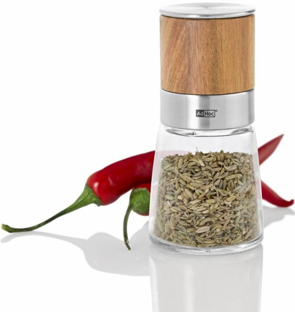 výška 13,5 cm průměr 6,5 cm materiál mlýnku nerez, sklo a akáciové dřevo vhodné na : chilli, kmín, kardamom, sušený zázvor, koriandr, anýz, fenykl, hořčičné semínko mechanismus mletí : nerezové struhadlo nerezové víčko proti vysypání obsahu vhodné na stůl i do kuchyně nevhodné do myčky snadná manipulace snadné plnění Mlýnek má patentovaný mechanizmus na koření (chilli) který "strouhá". Je určen pro koření, které má vláknitou strukturu a rozdrtit nejde. To je právě chilli. Jemně, velmi jemně ho nastrouhá. Mechanizmus mlýnku: Originální AdHoc SchneidWerk® detaily dělají rozdíl! Jedině správné použití různých bylin a koření činí z jídla skutečnou pochoutku. Kromě výběru správných příchutí je obzvláště důležité správné zpracování. AdHoc vyvinul SchneidWerk® tak, aby se aroma použitých bylin a koření plně rozvíjela. Originální AdHoc SchneidWerk® má speciální čepele z nerezové oceli s leptanými, ostrými zuby. Jsou navrženy tak, aby sušené byliny a koření byly krájeny jemně a dokonale.