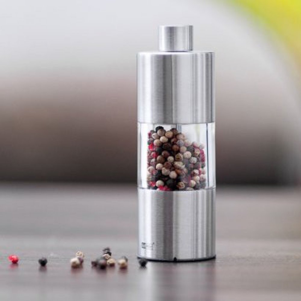 Mlýnek na koření ruční je vyroben z nerezu a akrylu. Jelikož je průhledný, naplněný kořením je požitkem nejen pro chuťové buňky, ale i pro oči. Má dva větší bratry ve stejném designu.