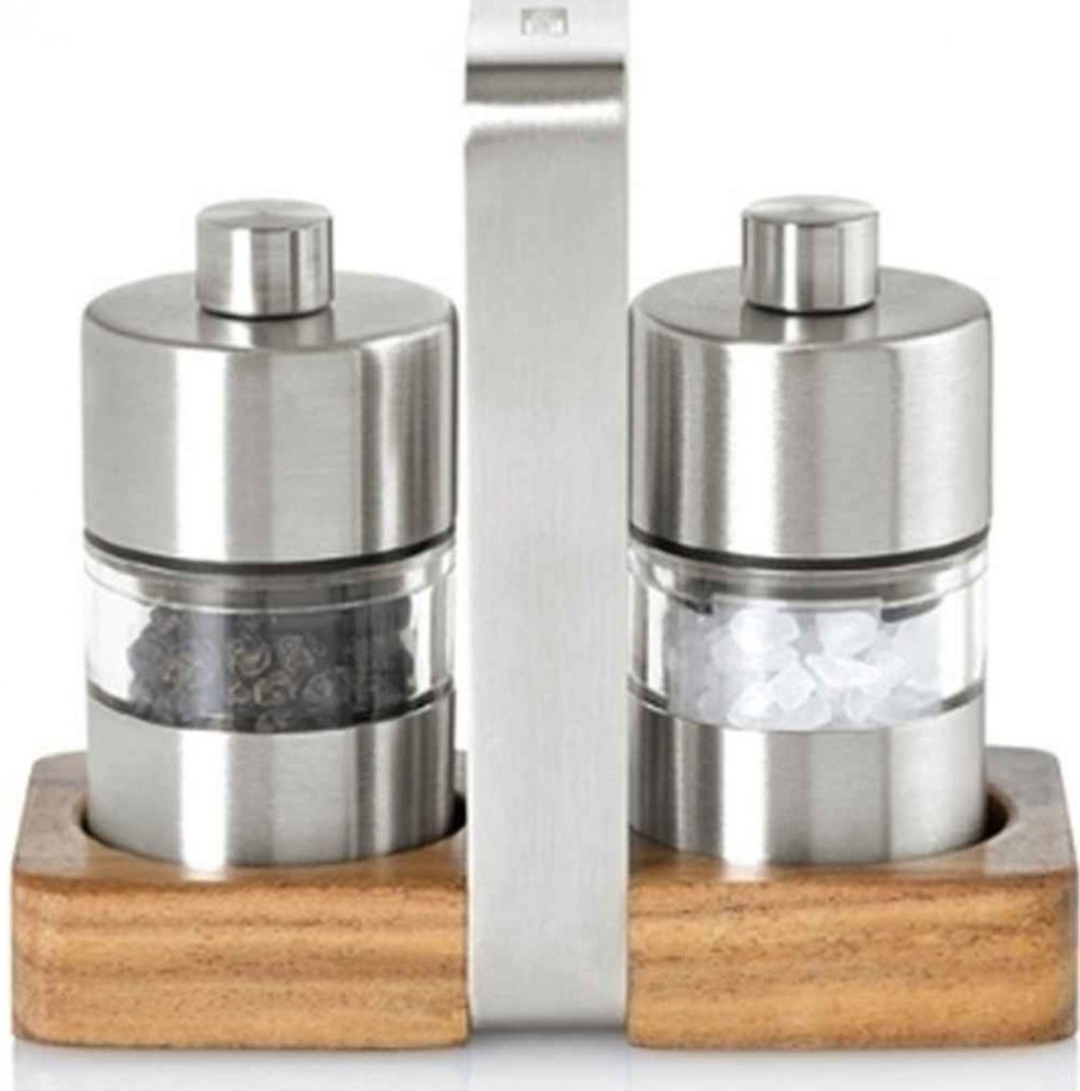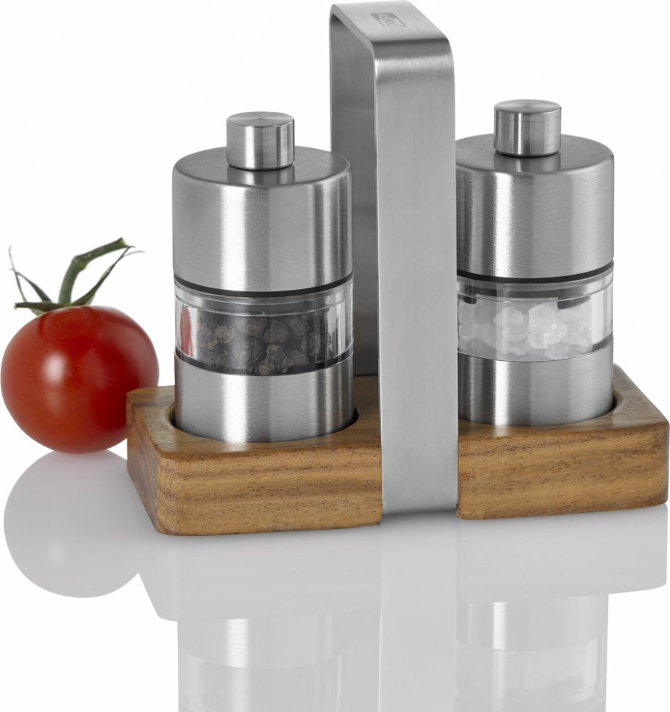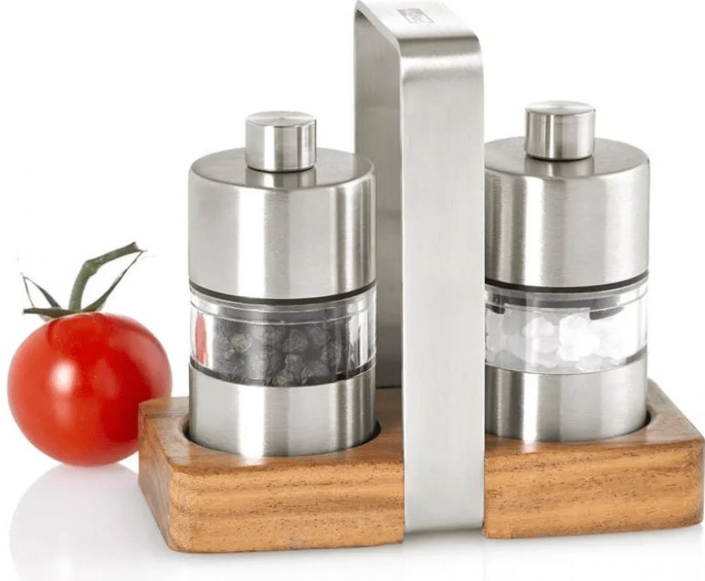 Set mlýnků na sůl a pepř z nerezové oceli a akrylu s dřevěným stojánkem.
