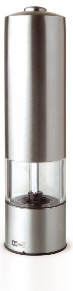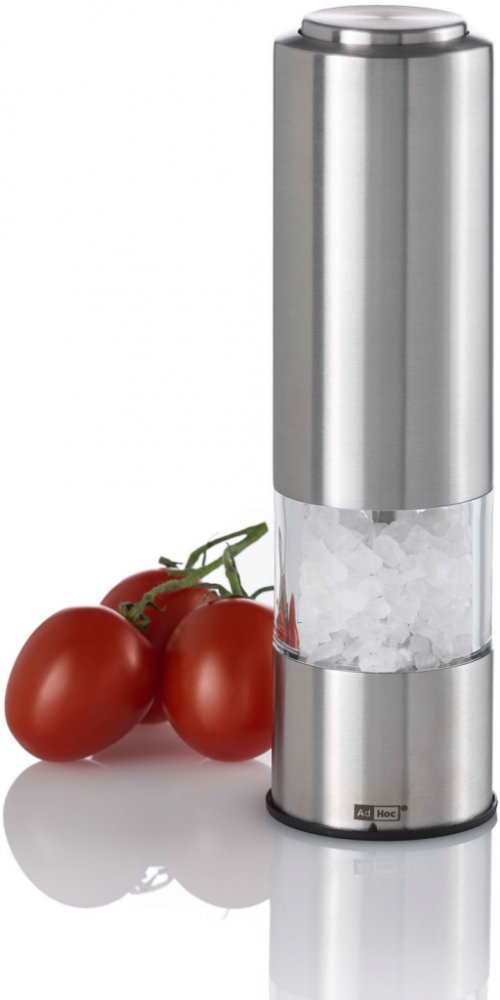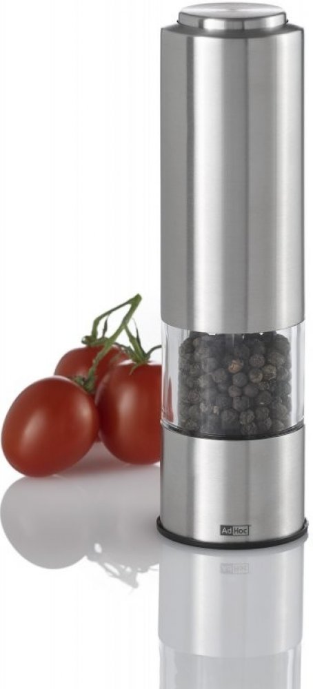 Elektrický mlýnek na pepř a sůl AdHoc PEPMATIK z nerezavějící oceli s LED osvětlením a mlecím mechanismem CeraCut, díky kterému lze snadno nastavit tloušťku mletí.