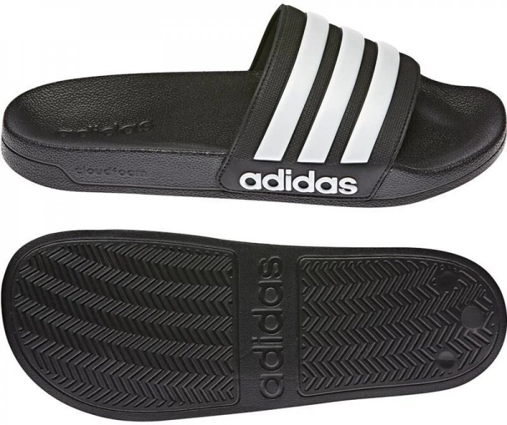 Pánské plážové pantofle v černé barvě s třemi bílými pruhy a nápisem adidas.