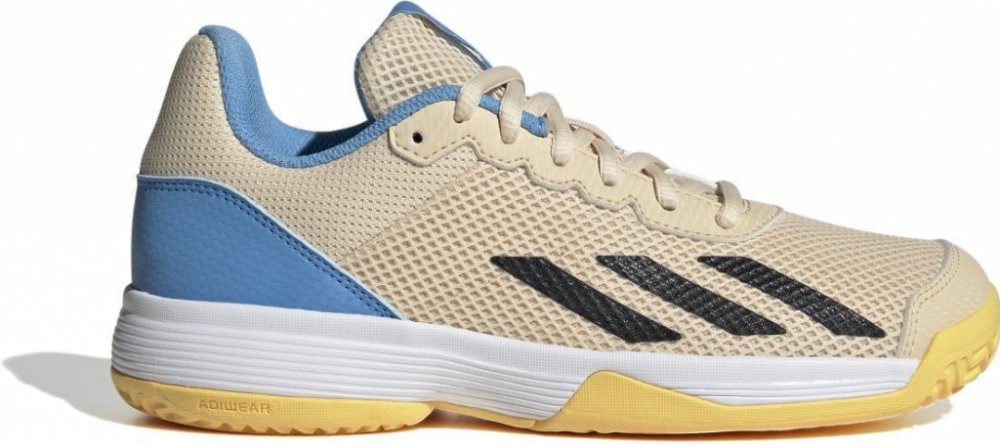 Juniorské tenisové boty Adidas Courtflash K - béžová/modrá/žlutá Extrémně lehký a pohodlný model obuvi. Má svršek vyrobený z prodyšného, síťovaného materiálu, a nejvíce exponované oblasti kolem prstů jsou dodatečně obloženy gumovou vrstvou. Texturovaný opatek zvyšuje stabilitu a poskytuje dodatečnou podporu. Odpovídající odpružení zajišťuje použitá pěna EVA ve střední části chodidla. Vnější podrážka z odolné gumy Adiwear zajišťuje odolnost proti oděru a dobrou trakci. Boty s univerzální podrážkou. Jsou vyrobeny alespoň z 50 % z recyklovaných materiálů.