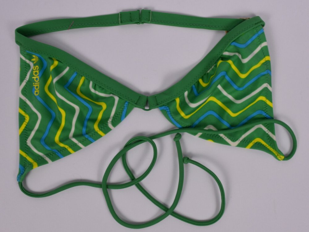 PRINT BKINI T W Dámský svršek bikin adidas Originals zelené E78348 PRINT BKINI T W Dámský stylový svršek bikin, z kolekce značky adidas Originals, je zelené barvy. Na přední straně vlevo, se nachází ve žluté barvě logo Originals a nápis adidas. Bikiny mají celoplošný grafický potisk vlnek, které jsou modré, žluté a bílé barvy. Plavky se zavazují za krkem pomocí dvou zelených tkaniček, druhé zapínání je na háček. Jsou velmi krásné a stylové. Vhodné pro plavecké účely. Materiál: Podšívka: 91% polyester, 9% elastan Tělo: 78% nylon, 22% elastan