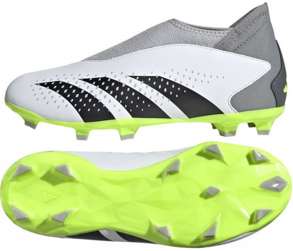 Dětské beztkaničkové kopačky lisovky Adidas Predator Accuracy. 3 Laceless FG v bílo-zeleném provedení byly zkonstruovány tak, aby zlepšily tvou přesnost s míčem u nohy. Textura High Definition Texture se rozprostírá po jejich měkké syntetické přední části a zajišťuje optimální přilnavost a kontrolu nad míčem. Podrážka je dokonale přizpůsobená pevnému povrchu, poskytuje maximální trakci, abys měl vše pod kontrolou. Svršek je vyrobený z řady recyklovaných materiálů a obsahuje nejméně 50 % recyklované příze. Tento produkt je součástí boje s plastovým odpadem. Kopačky typu FG (lisovky) - jsou určeny pro pevný přírodní povrch a k používání na mokrých až lehce blátivých hřištích s krátce posekaným trávníkem.