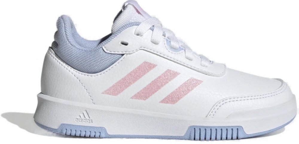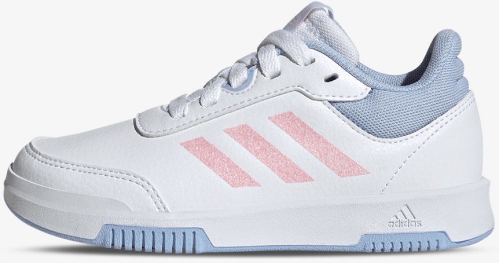Dívčí obuv adidas nabízí jemný design s třpytivými růžovými pruhy a modrými detaily. Bílé boty ze syntetické kůže odolávají nošení a přizpůsobují se různým typům nohou. Klasické šněrování se postará o pevné uchycení.