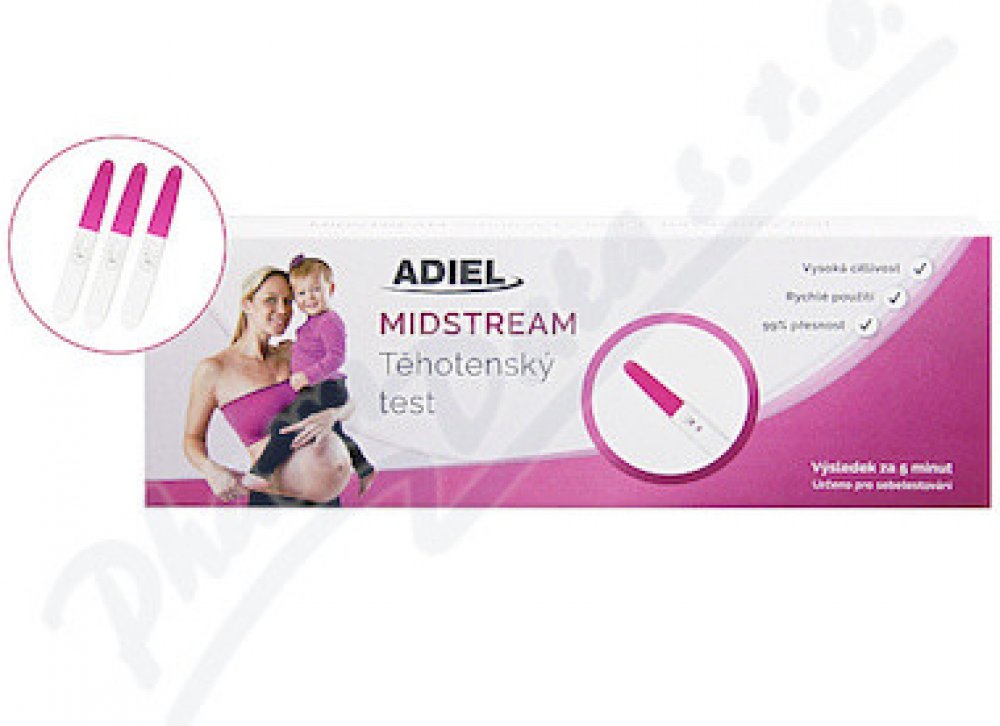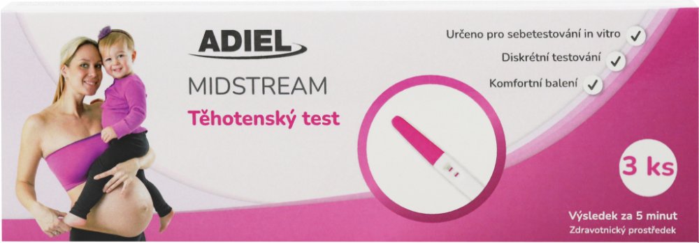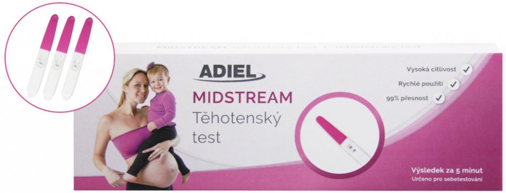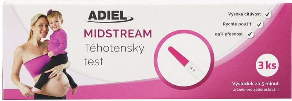Troj-balení těhotenského testu pro sebetestování s přesností 99%. Vysoce komfortní a hygienické testování pomocí plastového jednorázového testeru ADIEL Midstream. Vysoce citlivý těhotenský test spolehlivě určí těhotenství už krátce po oplodnění.