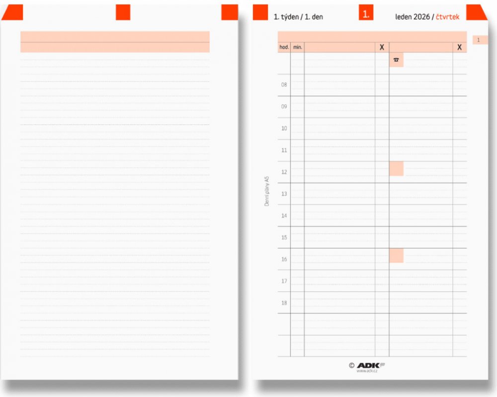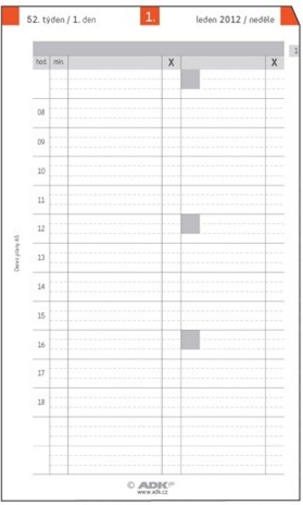 kazeta s víkem, dělící listy se symboly, diář, A-Z adresář, plánovací kalendář, denní plány termínovaný, týdenní plány - levé, roční plán, aktivity, nezapomeň, týdenní rozvrh, roční rozvrh, projekt, finance, pravidelné platby, klíčové oblasti, telefonní seznam, kontakty, internetové adresy, poznámkové listy, záznam z jednání, záznam z porady.