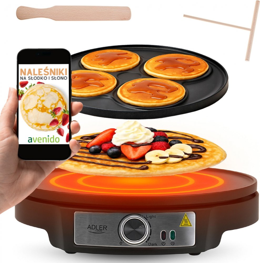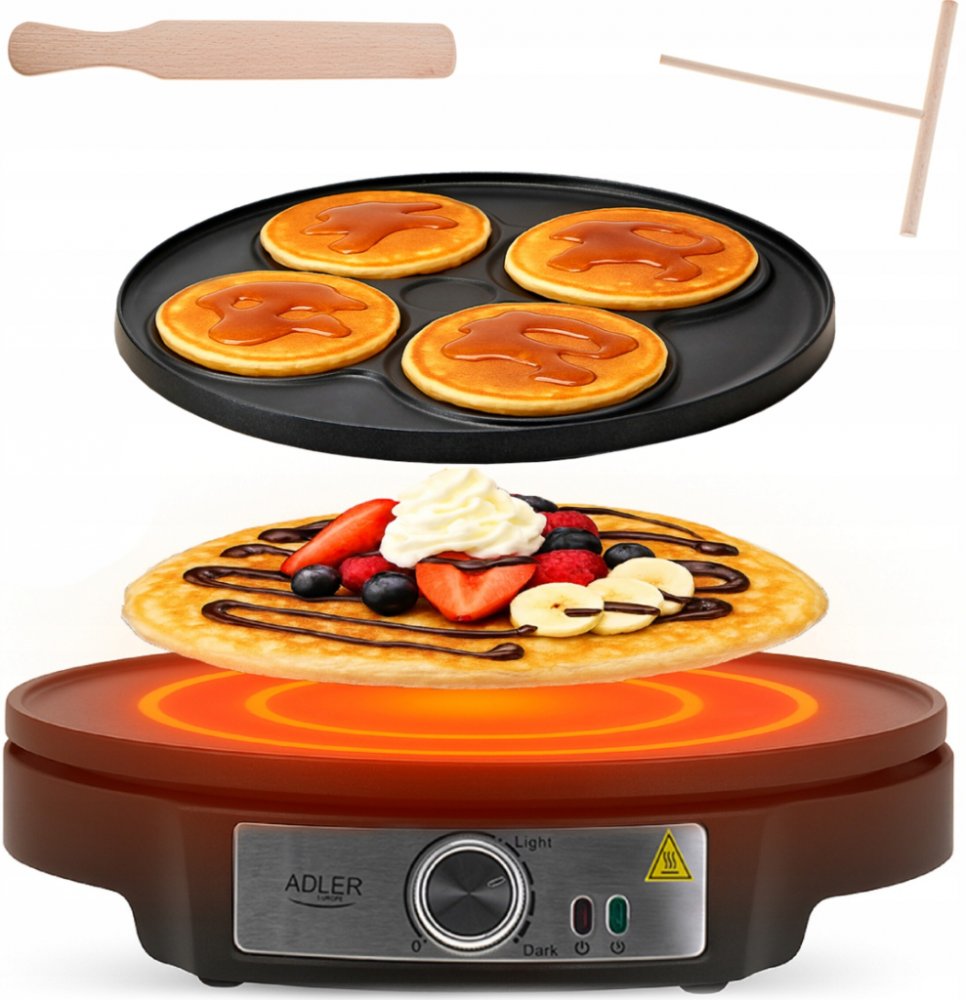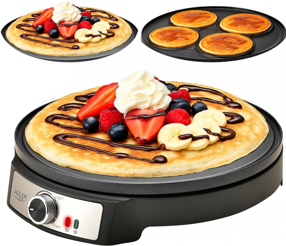 Palačinkovač s oboustrannou nepřilnavou deskou, z jedné strany na palačinky do průměru 30 cm, z druhé strany je forma na čtyři lívance, příkon 1600 W s plynulým ovládáním teploty, světelný indikátor zapnutí, stěrka k roztírání těsta ve tvaru T a špachtle, protiskluzové nožičky, rozměry (š x v x h): 330 x 72 x 305 mm, délka přívodní šňůry 750 mm.