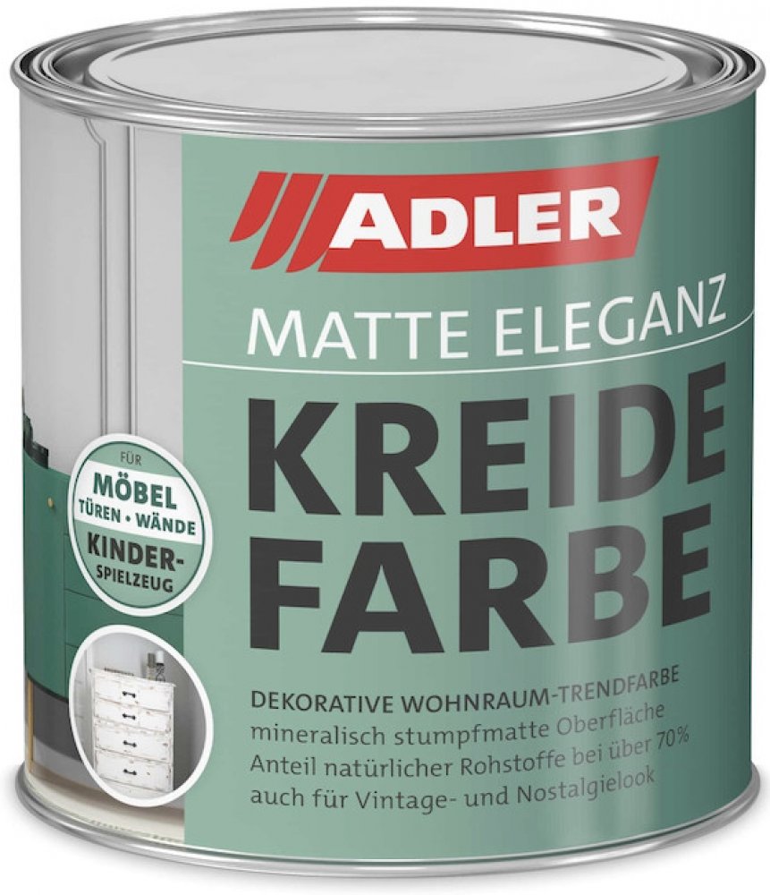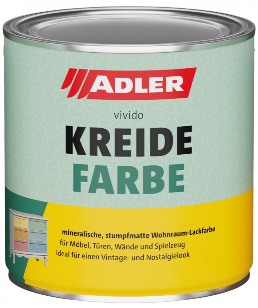 Křídová barva ADLER Kreidefarbe je matná vodou ředitelná barva na dřevo, kov nebo PVC do interiéru. Vytváří vintage retro efekt.