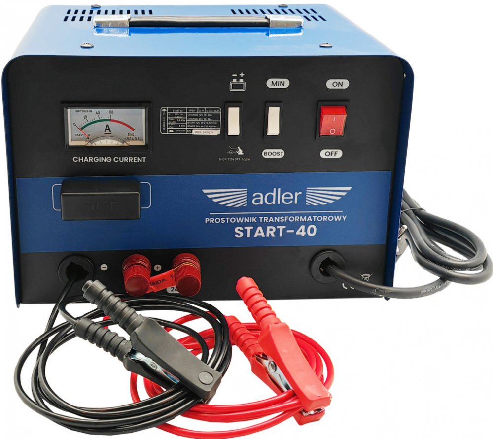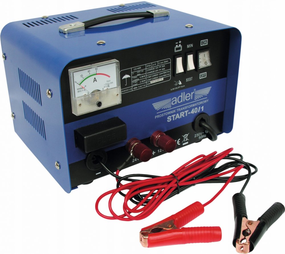Transformátorová nabíječka pro olověné akumulátory s funkcí startovacího režimu, nabíjecí napětí 12/24 V, pro baterie kapacity 30-500 Ah – ADLER START-40 Jednoduchá nabíječka se dvěma režimy nabíjení a jednoduchým použitím.Kryt přístroje je perforován pro maximální účinnost chlazení vinutého transformátoru, který zajišťuje stabilní a bezpečné nabíjení baterií.Kryt splňuje požadavky na třídu ochrany IP20 dle normy PN-EN 60529:2003.Nabíječka je vybavena analogovým ampérmetrem, který ukazuje aktuální nabíjecí proud.Přístroj disponuje i startovacím režimem pro vozy s vybitou autobaterií.Krokodýlové svorky zajišťují pevné a bezpečné připojení k nabíjené baterii.Součástí krytu je praktické madlo pro jednoduché přenášení. Technické údaje: · Napájecí napětí (V): 230 · Spotřeba energie (kW): 0,9-6