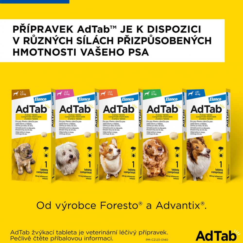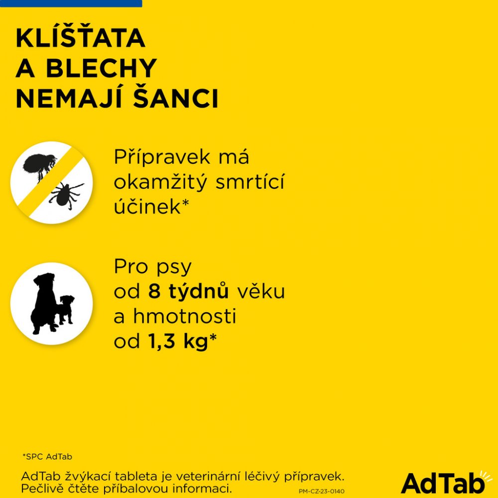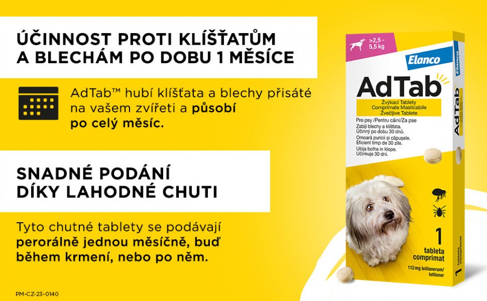 Váš pes si zamiluje masovou příchuť tablet AdTab – jedna tableta měsíčně jej ochrání před blechami a klíšťaty. Tablety AdTab podávejte s krmivem nebo po krmení, aby byla zajištěna maximální účinnost. Pro dosažení optimální kontroly proti napadení blechami a klíšťaty je vhodné přípravek AdTab podávat jednou měsíčně.