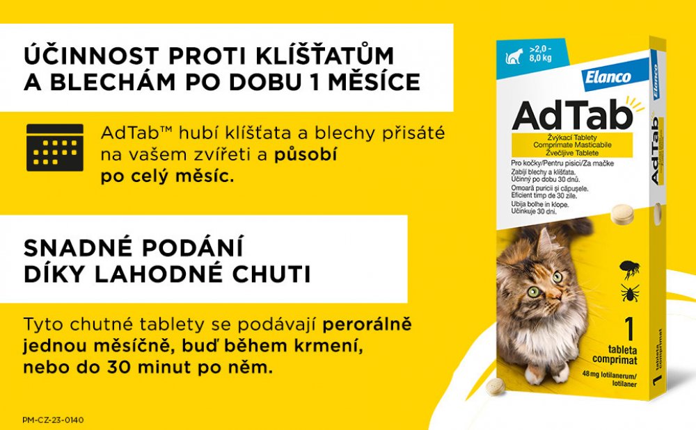 Rovněž k léčbě napadení blechami a klíšťaty u koček. Tento veterinární léčivý přípravek má okamžitý smrtící účinek na blechy a klíšťata, který trvá 1 měsíc. Od stejného výrobce osvědčených značek Advantage a Foresto. Vaše kočka bude chutné vanilkové tablety AdTab přímo zbožňovat. Pro zajištění maximální účinnosti dávejte kočce jednu žvýkací tabletu měsíčně, a to současně s krmivem nebo do 30 minut po krmení. Tablety AdTab můžete zakoupit bez předpisu a snadno je najdete v lékárnách a jejich e-shopech. AdTab vám ušetří čas i nepříjemnosti. Podávejte přímo u vás v pohodlí domova, aniž byste tím vaši kočku stresovali.