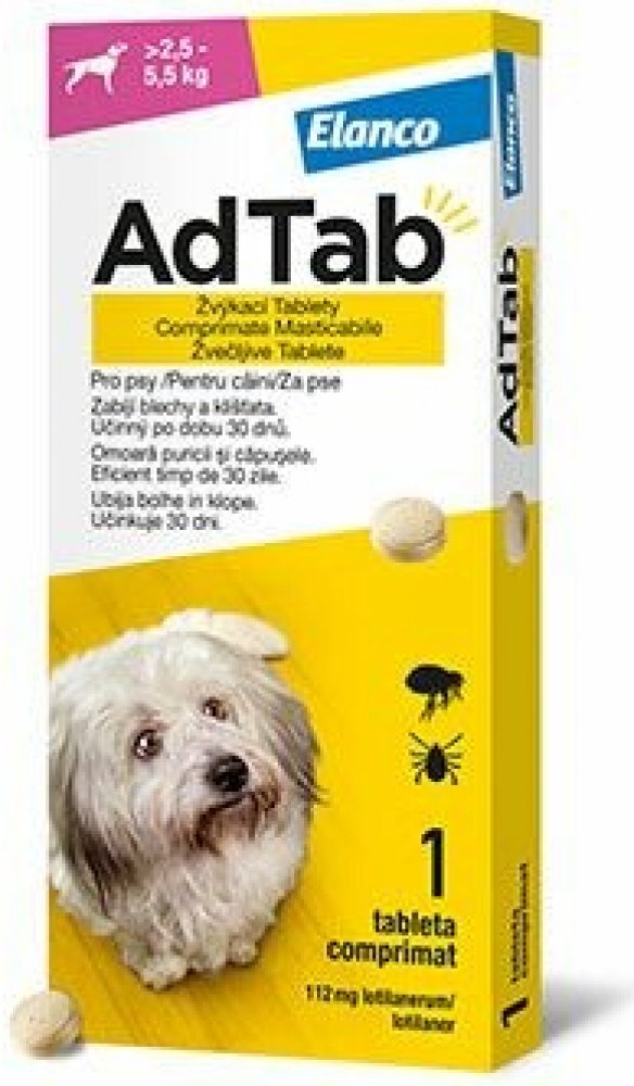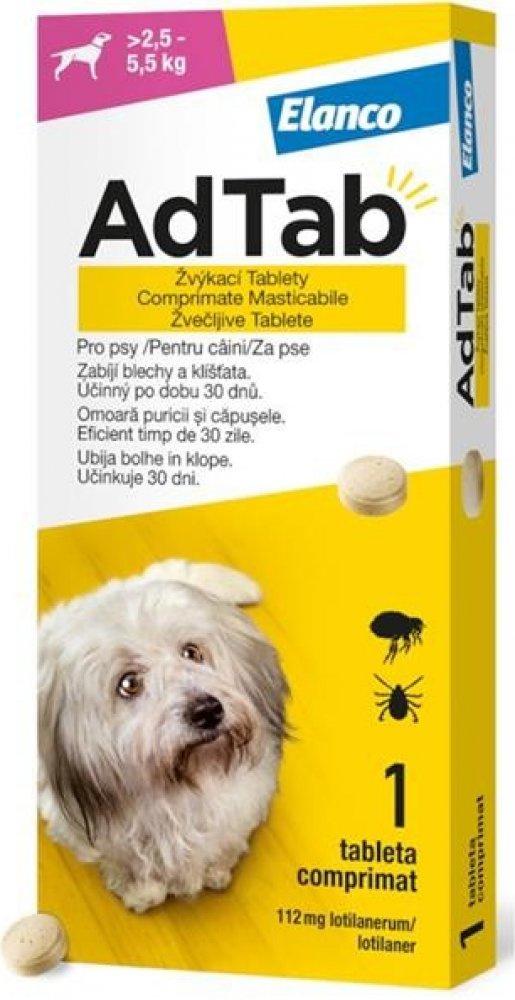 AdTab 112 mg žvýkací tablety pro psy (2,5-5,5 kg) AdTab je malá žvýkací tableta s masovou příchutí a rychlým nástupem účinku, která vašemu psovi poskytuje ochranu před blechami a klíšťaty. Od stejného výrobce osvědčených značek Advantage® a Foresto®.Váš pes si zamiluje masovou příchuť tablet AdTab – jedna tableta měsíčně jej ochrání před blechami a klíšťaty. Tablety AdTab podávejte s krmivem nebo po krmení, aby byla zajištěna maximální účinnost. Pro dosažení optimální kontroly proti napadení blechami a klíšťaty je vhodné přípravek AdTab podávat jednou měsíčněTablety AdTab můžete zakoupit bez předpisu a snadno je najdete v lékárnách a jejich e-shopech. AdTab vám ušetří čas i nepříjemnosti. Podávejte přímo u vás v pohodlí domova, aniž byste tím vašeho pejska stresovali. Jak AdTab působíLéčivou látkou přípravku AdTab je lotilaner, který vyvolává nadměrnou stimulaci nervových buněk cílových druhů hmyzu a roztočů. Blechy a klíšťata rychle hynou. Lotilaner je pouze v ČISTÉ AKTIVNÍ FORMĚ, čímž méně zatěžuje organismus zvířete.Účinná látka:lotilanerumDávkování:AdTab podávejte s krmivem nebo po krmení, aby byla zajištěna jeho maximální účinnost. Jednoduše zvolíte vhodnou velikost tablety podle váhy vašeho psa. Díky pěti dostupným velikostem tablet je snadné zvolit správnou dávku. Pro zajištění správného dávkování je třeba určit hmotnost vašeho psa co nejpřesněji. Pro dosažení optimální kontroly proti napadení blechami a klíšťaty je vhodné přípravek AdTab podávat jednou měsíčně. Zvláštní opatření pro použití:Vhodné pro dospělé psy i štěňata od 8 týdnů a s živou hmotností od 1,3 kg.Kontraindikace:Nepoužívat v případech přecitlivělosti na léčivou látku nebo na některou z pomocných látek.AdTab žvýkací tableta je veterinární léčivý přípravek, údaje vychází ze schváleného SPC (Souhrnu údajů o přípravku). Pečlivě čtěte příbalovou informaci. AdTab, Elanco, Elanco logo-šikmý pruh jsou obchodní značky ve vlastnictví společnosti Elanco nebo jejích obchodních poboček.