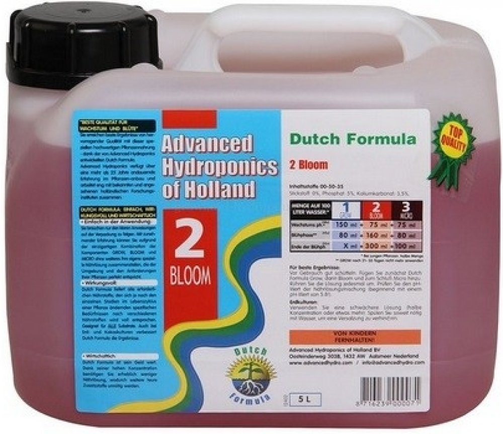 - Nejlepší kvalita pro květ rostlin. Díky tomu, že Advanced Hydroponics vyvinuli Dutch Formula, dosáhnete i Vy s tímto speciálním vysoce hodnotným hnojivem nejlepších výsledků a vynikající kvality.