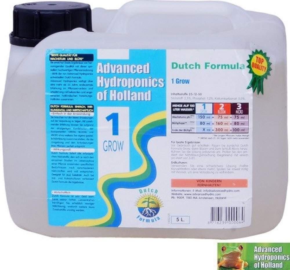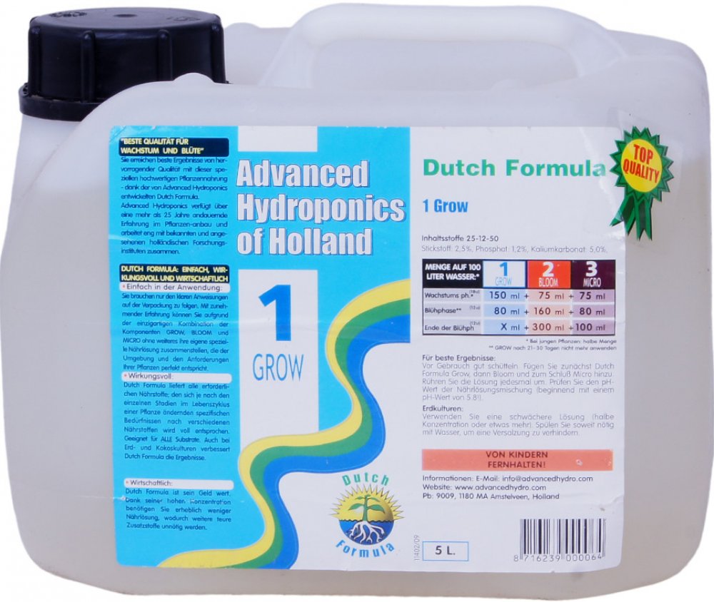 - Nejlepší kvalita pro růst rostlin. Díky tomu, že Advanced Hydroponics vyvinuli Dutch Formula, dosáhnete i Vy s tímto speciálním vysoce hodnotným hnojivem nejlepších výsledků a vynikající kvality.