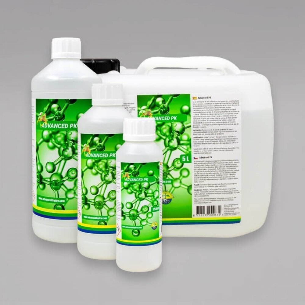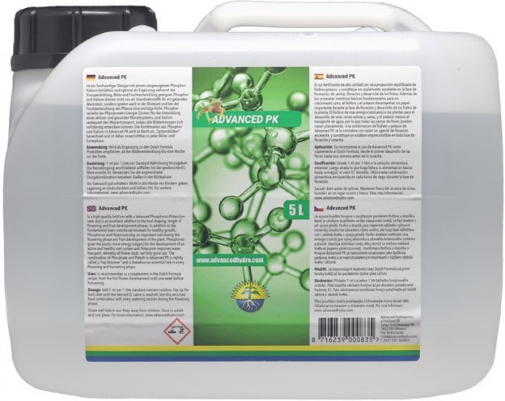 Dávkování: Přidejte 1ml Advanced PK na jeden litr běžného hnojivového roztoku. Poté doplňte základní hnojivo až po dosažení požadované hodnoty EC. Tuto obohacenou kombinaci hnojiv používejte při každé zálivce v období květu (bloom). Před použitím dobře protřepejte.