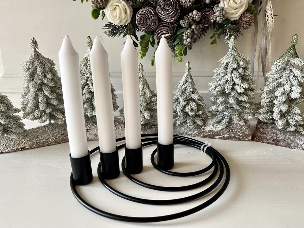 Ozdobte si Vánoce. Jednoduchý černý adventní kovový svícen složený ze čtyř volných a různě velkých kruhů si můžete doladit podle svých představ (pootočením kruhů bude svícen pokaždé vypadat jinak). Vytvořte si slavnostní aranžmá, které podtrhne kouzelnou atmosféru vánočních svátků u Vás doma.