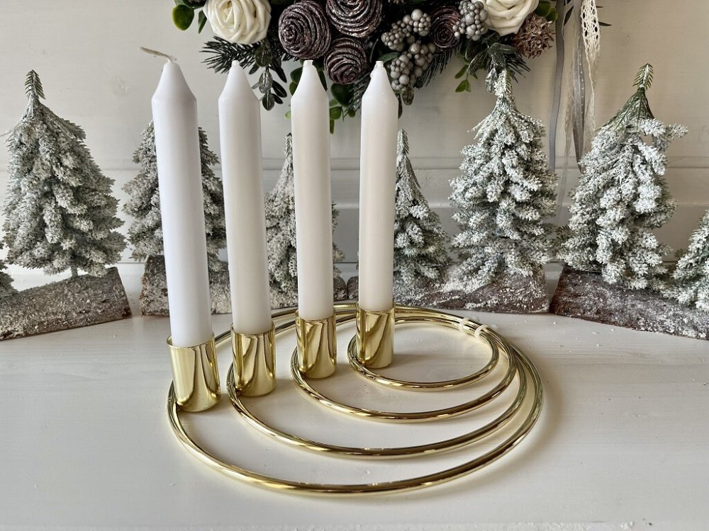Ozdobte si Vánoce. Jednoduchý zlatý adventní kovový svícen složený ze čtyř volných a různě velkých kruhů si můžete doladit podle svých představ (pootočením kruhů bude svícen pokaždé vypadat jinak). Vytvořte si slavnostní aranžmá, které podtrhne kouzelnou atmosféru vánočních svátků u Vás doma.
