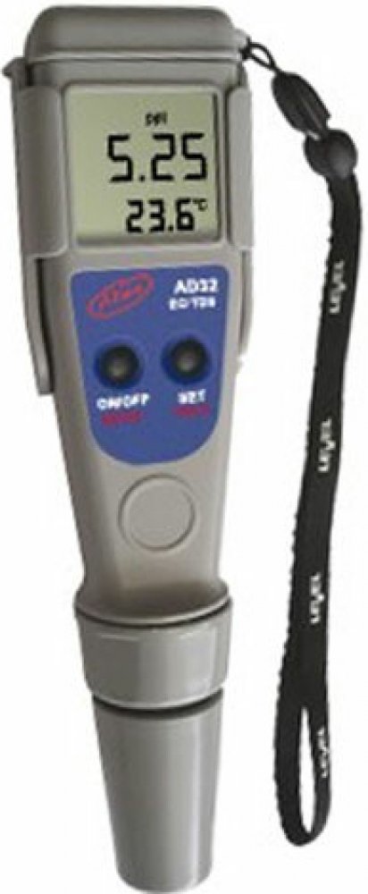 Plně vodotěsný konduktometr pro měření elektrické vodivosti (EC, měřeno v µS/cm), množství rozpuštěných částic ve vodě (TDS, měřeno v ppm) a také teploty v °C/°F. Všechny naměřené hodnoty jsou automaticky teplotně kompenzovány.