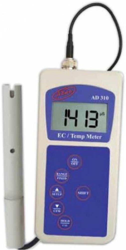 Přenosný kompaktní pH metr AD310, určený pro profesionální měření ORP a teploty vody. Měřič má funkci automatického nastavení EC, která nastaví stupnici přístroje s nejvyšším vhodným rozsahem a zároveň i s velkou přesností.Hlavní výhody:Malé rozměry a nízká hmotnostautomatická i manuální teplotní kompenzace měření (ATC / MTC)LCD display pro snadné odečítání naměřených hodnotindikátor vybitíMožnost nastavení vlastního teplotního koeficientuIndikátor stability měřeníBalení obsahuje: 1x zařízení AD310, 1x AD76309 sonda vodivosti s teplotním senzorem a 1m kabelem, kalibrační roztok (1413 ìs / cm, 20ml sáček), 4x 1.5V AA baterie, manuálSPECIFIKACE:Sonda - je měnitelnáKalibrace teploty: automatická i manuálníEC kalibrace - vypnutí: 0,0 / ìs / cm; 6 paměťových hodnot nebo jedna vlastníRozsah měření: EC - 19,99; 199,9; 1999 c19,99; 199,9 mS / cmTeplota: od -9,9 ° C do 120,0 ° COdchylka: 0,01; 0,1; 1,0 ms / cm0,01; 0,1 mS / cm0,1 ° CPřesnost: EC - ± 1% fsTepl - ± 0,5 ° CBaterie: 4x 1.5V AAŽivotnost baterie: cca 200 hodinAutomatické vypnutí po 5 minRozměry: 70 x 145 x 26 mmHmotnost: 200gSPECIFIKACE:Sonda - je měnitelnáKalibrace teploty: automatická i manuálníEC kalibrace - vypnutí: 0,0 / ìs / cm; 6 paměťových hodnot nebo jedna vlastníRozsah měření: EC - 19,99; 199,9; 1999 c19,99; 199,9 mS / cmTeplota: od -9,9 ° C do 120,0 ° COdchylka: 0,01; 0,1; 1,0 ms / cm0,01; 0,1 mS / cm0,1 ° CPřesnost: EC - ± 1% fsTepl - ± 0,5 ° CBaterie: 4x 1.5V AAŽivotnost baterie: cca 200 hodinAutomatické vypnutí po 5 minRozměry: 70 x 145 x 26 mmHmotnost: 200g