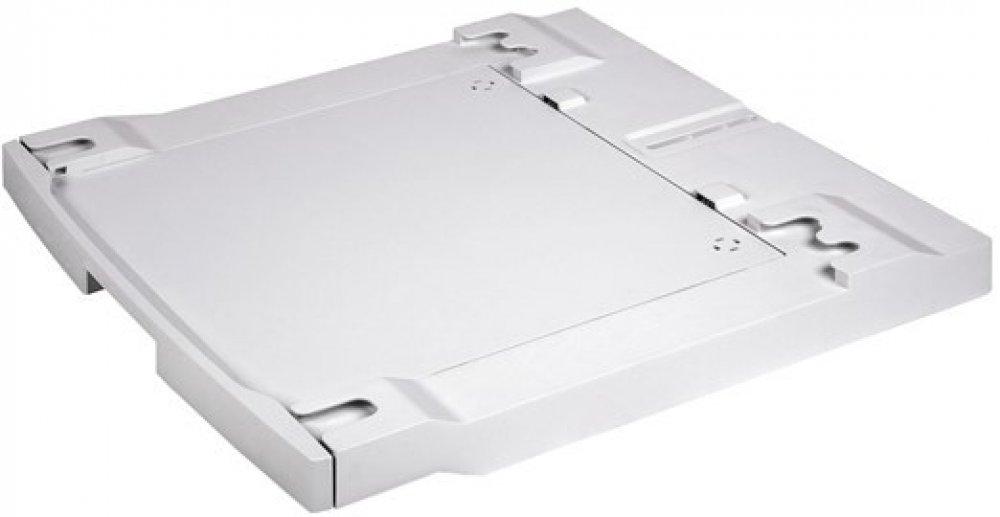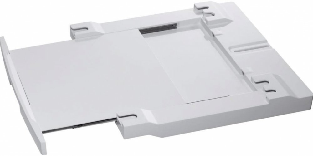 Uložení sušičky na pračku představuje prostorově úsporné řešení. Spojovací sada s výsuvnou policí vám poskytuje praktické místo pro třídění prádla po vyjmutí z pračky nebo jeho složení po vyjmutí ze sušičky.