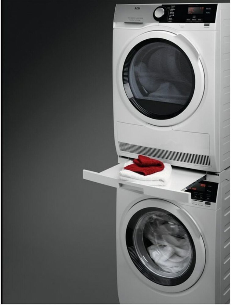 Uložení sušičky na pračku představuje prostorově úsporné řešení. Univerzální spojovací sadu lze použít pro všechny pračky a sušičky AEG s předním plněním a hloubkou od 52 do 67 cm.