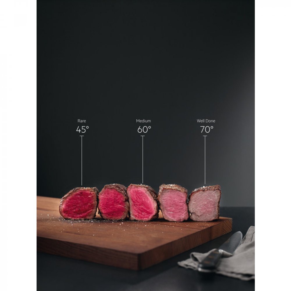 Zasunete sondu do středu masa nebo ryby, nastavíte teplotu a až bude pokrm upečen tak, jak si přejete, budete na to upozorněni.