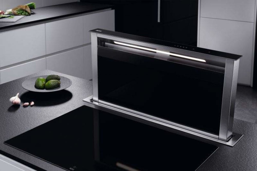 Výkonný výsuvný odsavač se rafinovaně ukrývá v pracovní desce. Stisknutím tlačítka jej při vaření zdvihnete a zapnete. Když dovaříte, jednoduše jej zasunete zpět, abyste měli čistou a prostornou pracovní desku.