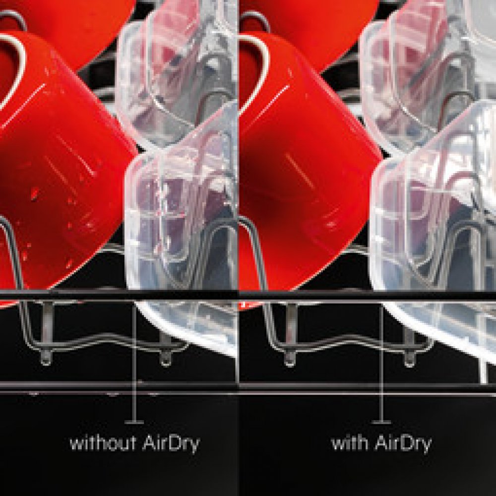 Technologie AirDry díky cirkulaci vzduchu maximalizuje sušicí výkon a zároveň minimalizuje spotřebu energie. Dvířka myčky se před koncem sušícího cyklu pootevřou o 10 centimetrů, aby dovnitř vnikl vzduch, který nádobí dosuší.