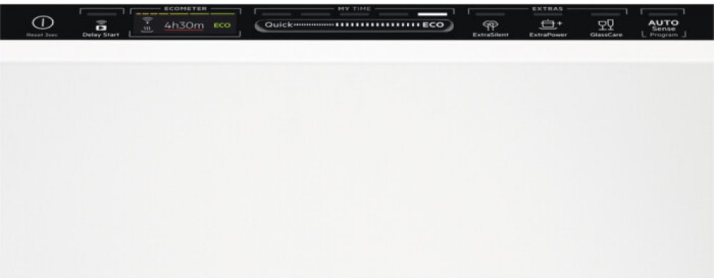 Indikace funkcí: budík, zpožděný start 1-24h, extra tichý, GlassCare, indikátor pro leštidlo, sůl, Time beam White, XtraPower - extra silný