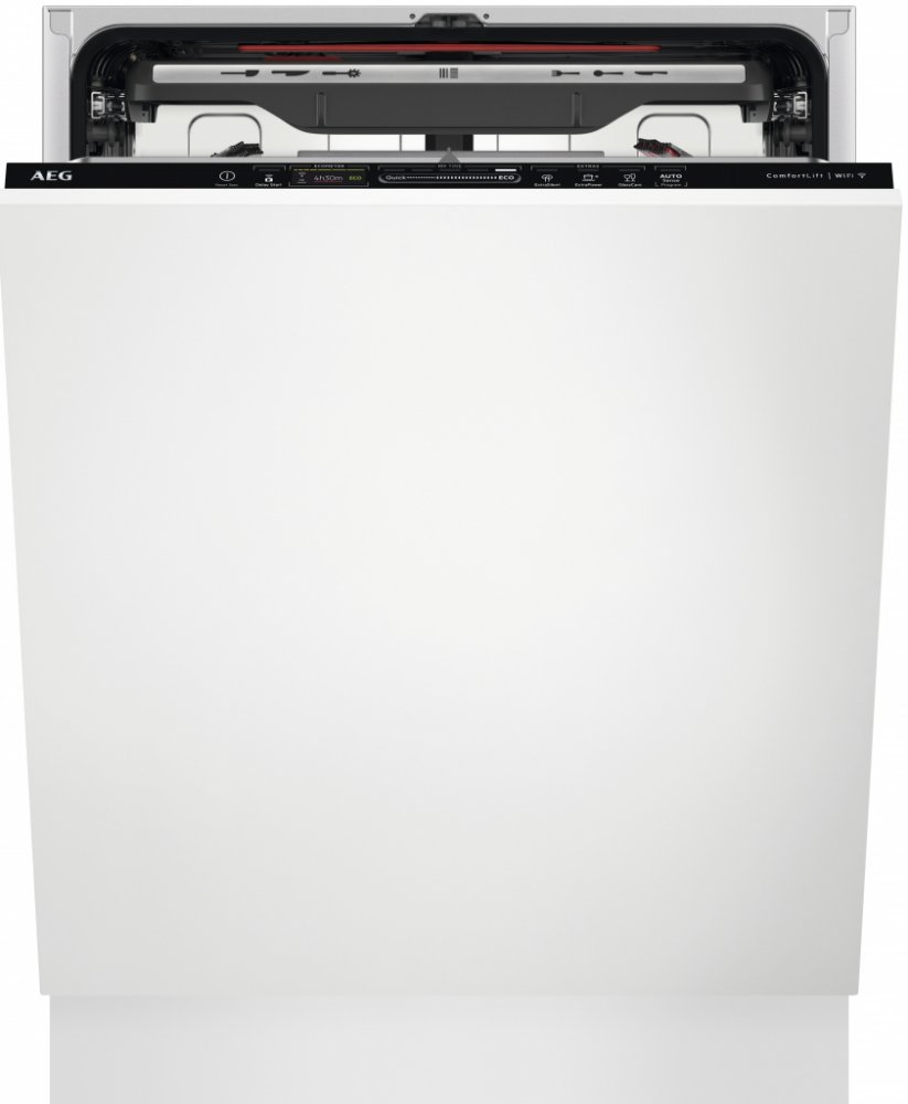 Horní košík má 2 skládací držáky, 2 skládací drátěné držáky pro skleničky, 2 měkké špičky, 6 měkkých špiček pro vinné sklenky, skládací poličky na šálky, nerezové držadlo AEG, Postranní držáky košíku