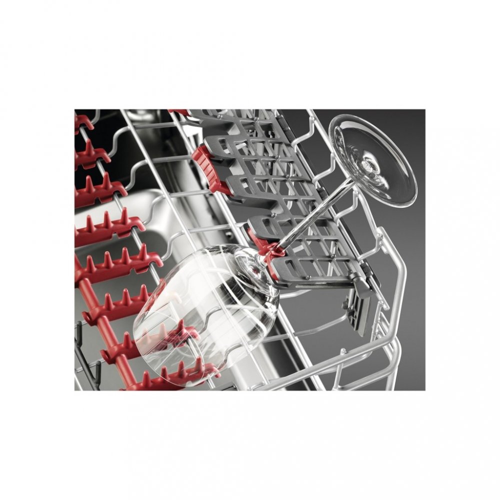 Horní košík má 2 skládací držáky, 2 skládací drátěné držáky pro skleničky, 2 měkké špičky, 6 měkkých špiček pro vinné sklenky, skládací poličky na šálky, Premium Rails, nerezové držadlo AEG, boční úchyty koše