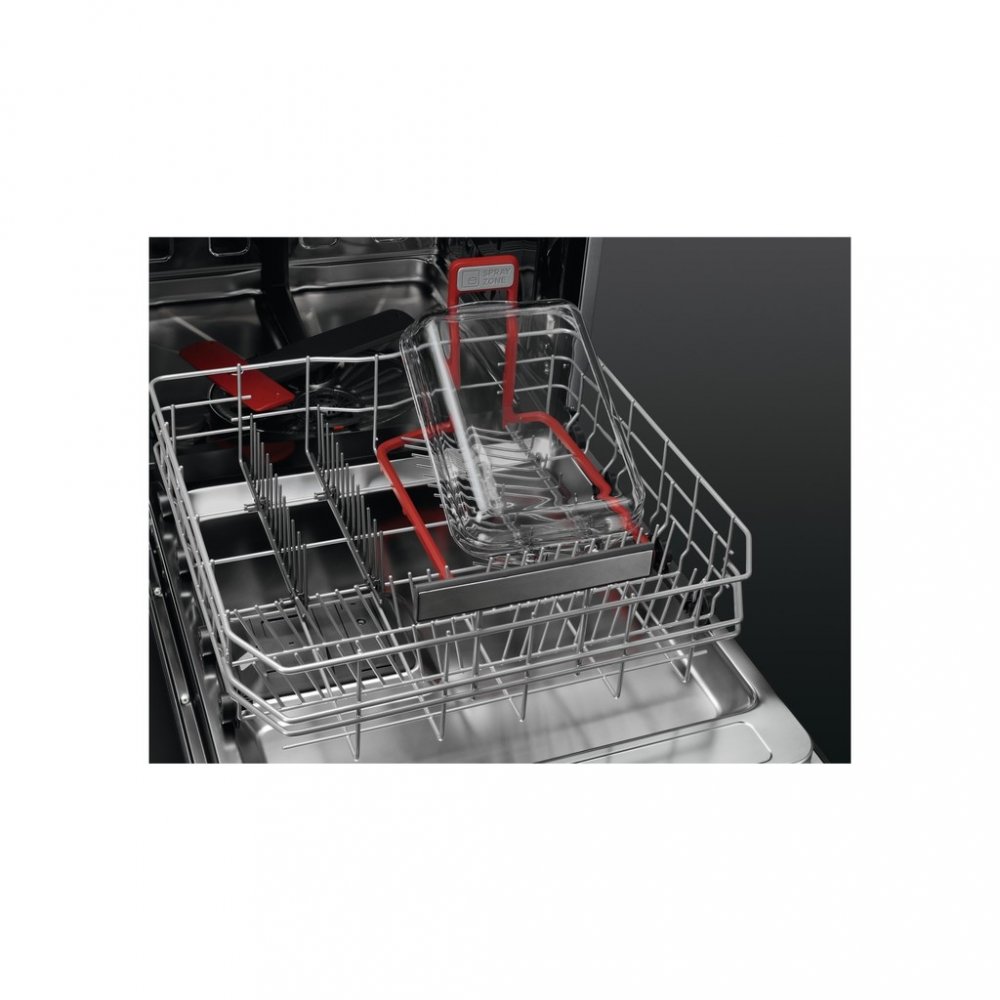 Dolní košík má 4 rozložitelné talířové poličky, Spray Zone, Nerezové držadlo