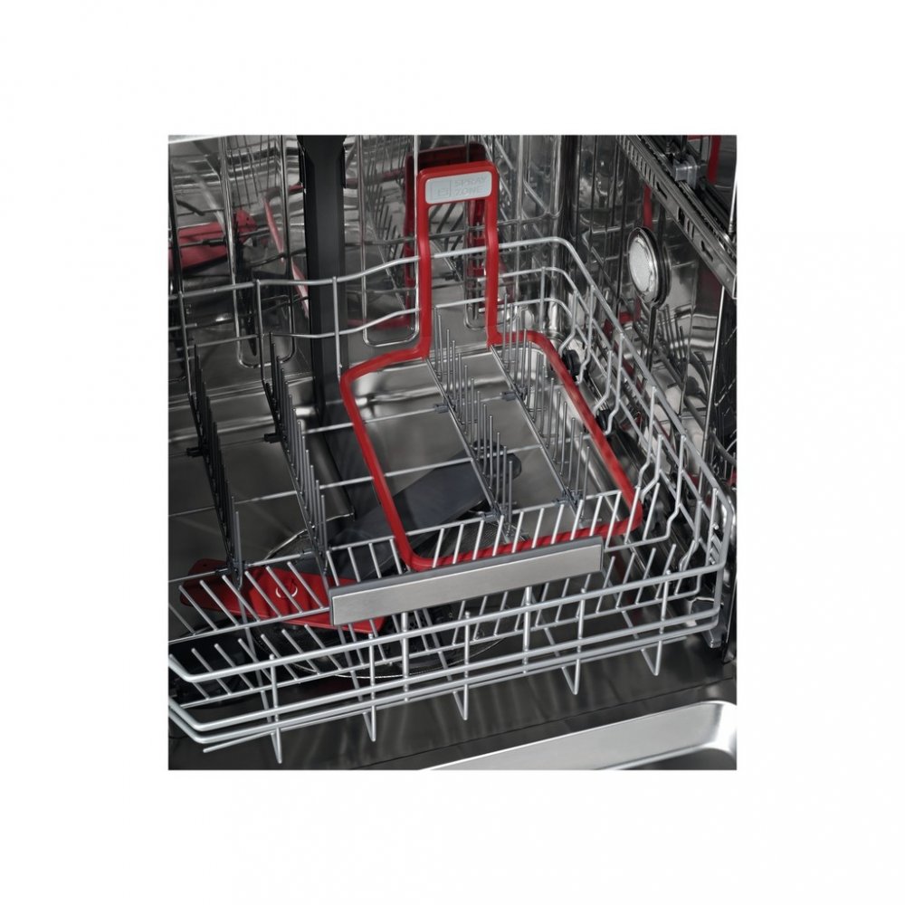 Horní košík má 2 skládací držáky, 2 skládací drátěné držáky pro skleničky, 2 měkké špičky, 6 měkkých špiček pro vinné sklenky, skládací poličky na šálky, Premium Rails, nerezové držadlo AEG, Postranní držáky košíku