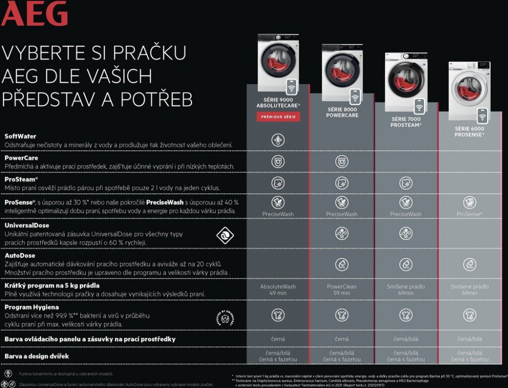 - Prací programy: MixLoad 69min, Eco 40-60, bavlna , syntetika, jemné prádlo, vlna , 20 min. - 3 kg, pára, outdoor, Hygiene, máchání , odstřeď./vypouštění