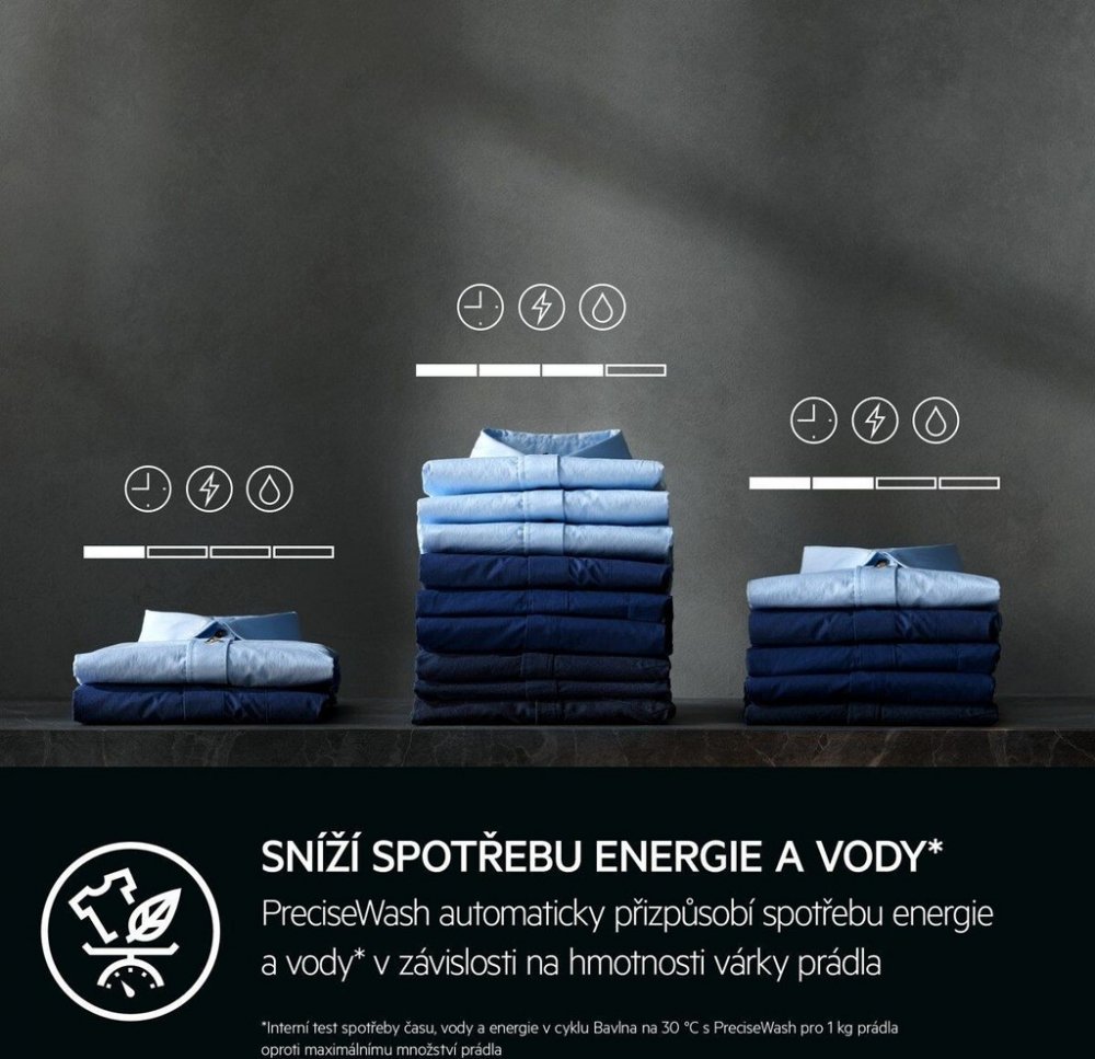 PRECISEWASH SNÍŽÍ AŽ O 40 % SPOTŘEBU ENERGIE, VODY A ČASU* DÍKY OPTIMALIZACI KAŽDÉ VÁRKY PRÁDLA