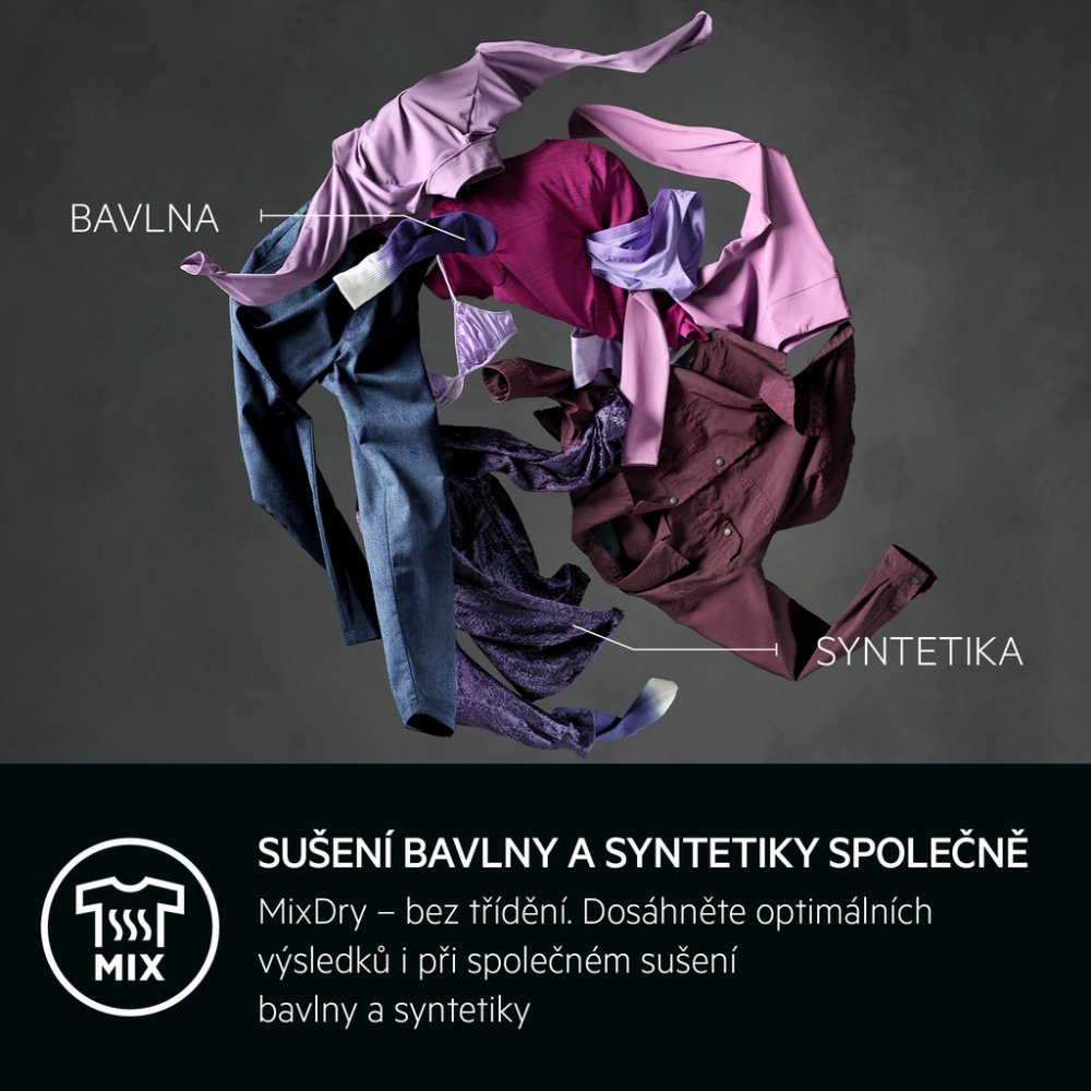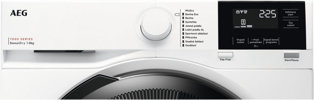 Indikátory fáze sušení pro: suché do skříně, automatické ochlazování po ukončení programu, suché k žehlení, suché do skříně, extra suché, funkce proti pomačkání - konec