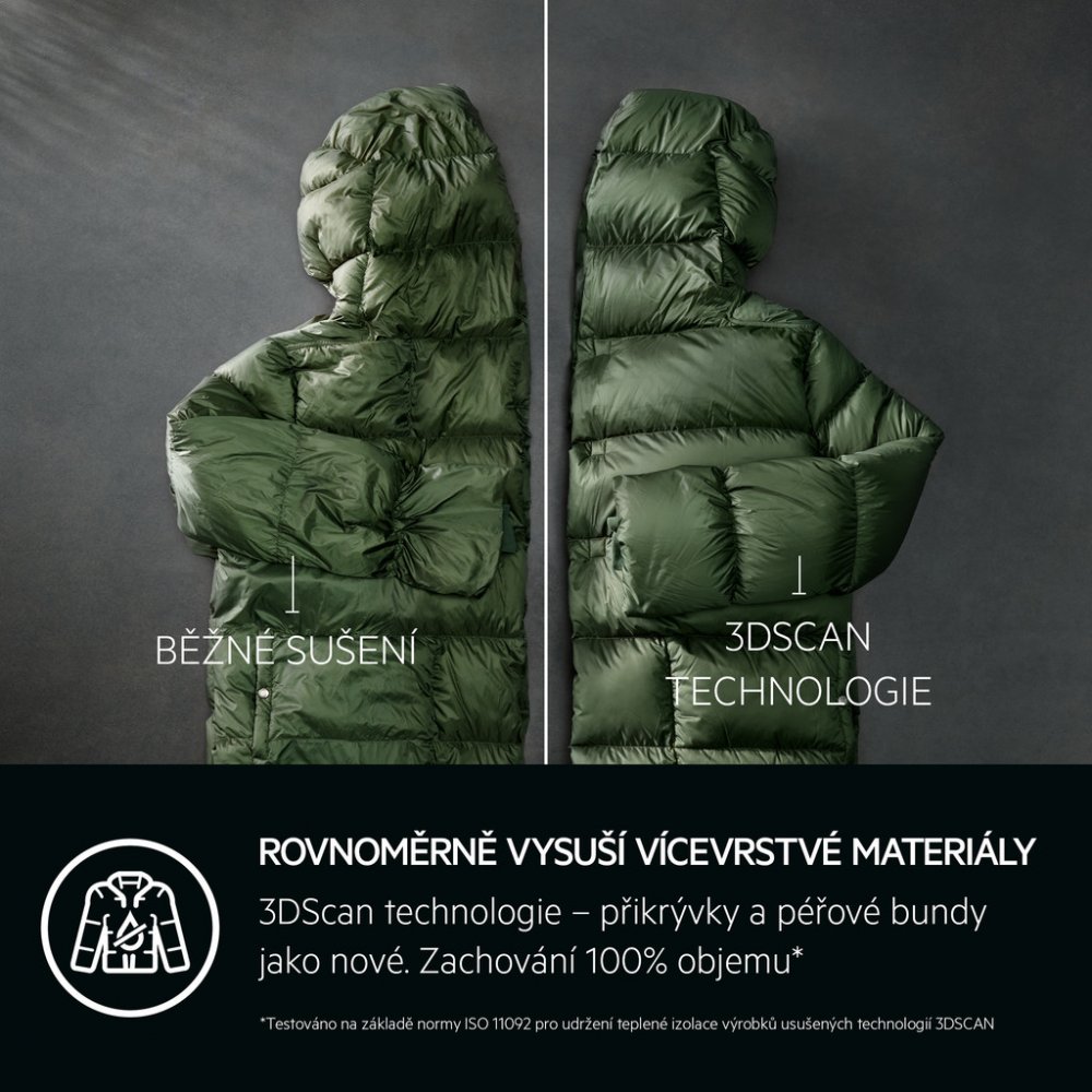 Sušička 9000 Absolute Care® Plus nabízí vynikající výsledky sušení a péči díky technologii 3DScan a Absolute Care®. Snímá úroveň vlhkosti uvnitř prádla a zajišťuje rovnoměrné vysušení i u vícevrstvých oděvů. Zajistí, že vaše oblečení a péřové bundy zůstanou nadýchané a udrží si své izolační vlastnosti.