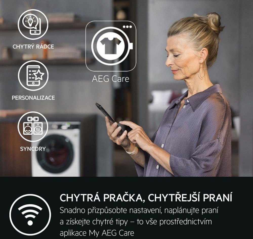 NOVÁ GENERACE PRANÍ PRÁDLA S APLIKACÍ MY AEG CAREPomocí aplikace My AEG Care můžete přizpůsobit nastavení a získat chytré tipy a návrhy. Přizpůsobte si prací cykly a posílejte spotřebiči pokyny, aby se přizpůsobil vašim potřebám a zvyklostem. Chytrá a snadná péče prostřednictvím vašeho chytrého telefonu.