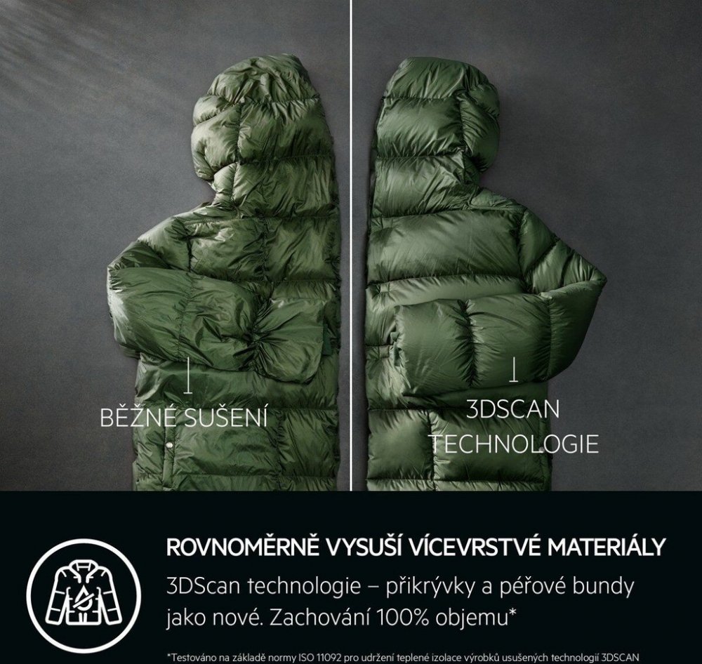 TECHNOLOGIE 3DSCAN. PŘIKRÝVKY A PÉŘOVÉ BUNDY JAKO NOVÉ. ZACHOVÁNÍ 100% OBJEMU*Technologie 3DScan poskytuje tu nejvyšší péči při sušení prádla. Scanuje úroveň vlhkosti do hloubky a zajišťuje perfektní výsledek sušení. Bezpečně rozezná materiál oblečení, které zůstane nadýchané a obnovuje i jeho izolační vlastnosti.*Testováno na základě normy ISO 11092 pro udržení tepelné izolace přikrývek/prádla usušených technologií 3DScan.