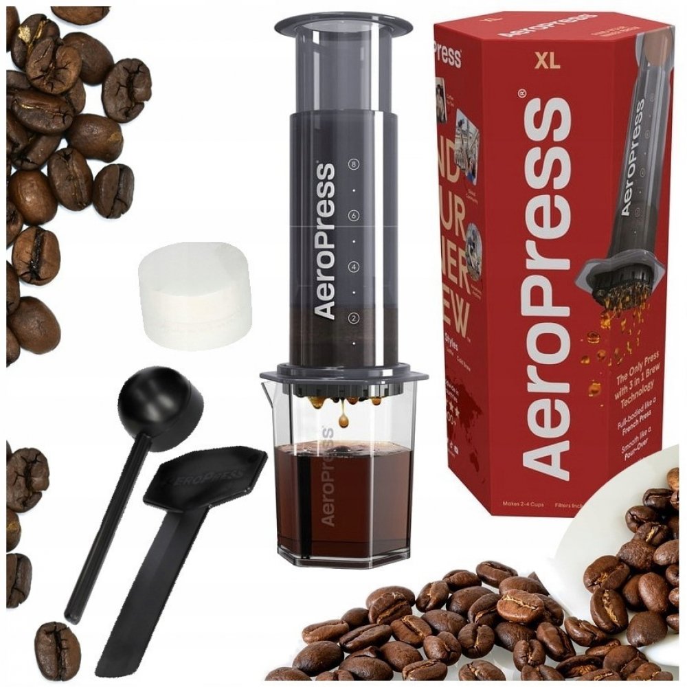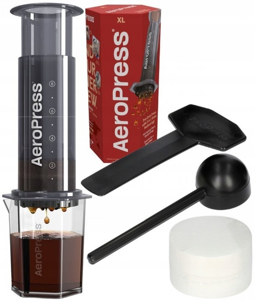 Obsah balení: AeroPress XL, Tritanová nádobka, 100 ks papírových filtrů, míchadlo na kávu, odměrka na kávu.