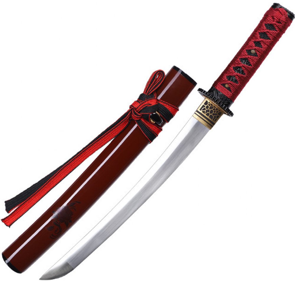 Toto elegantní a kvalitně vyrobené tanto z karbonové oceli 1065. Na rukojeti tohoto tanta najdete imitaci rejnočí kůže obmotanou bavlněným opletem v červené barvě. Čepel tohoto tanta je jištěna dvěma kolíčky, jako bývá u tradičních katan a nožů tanto.