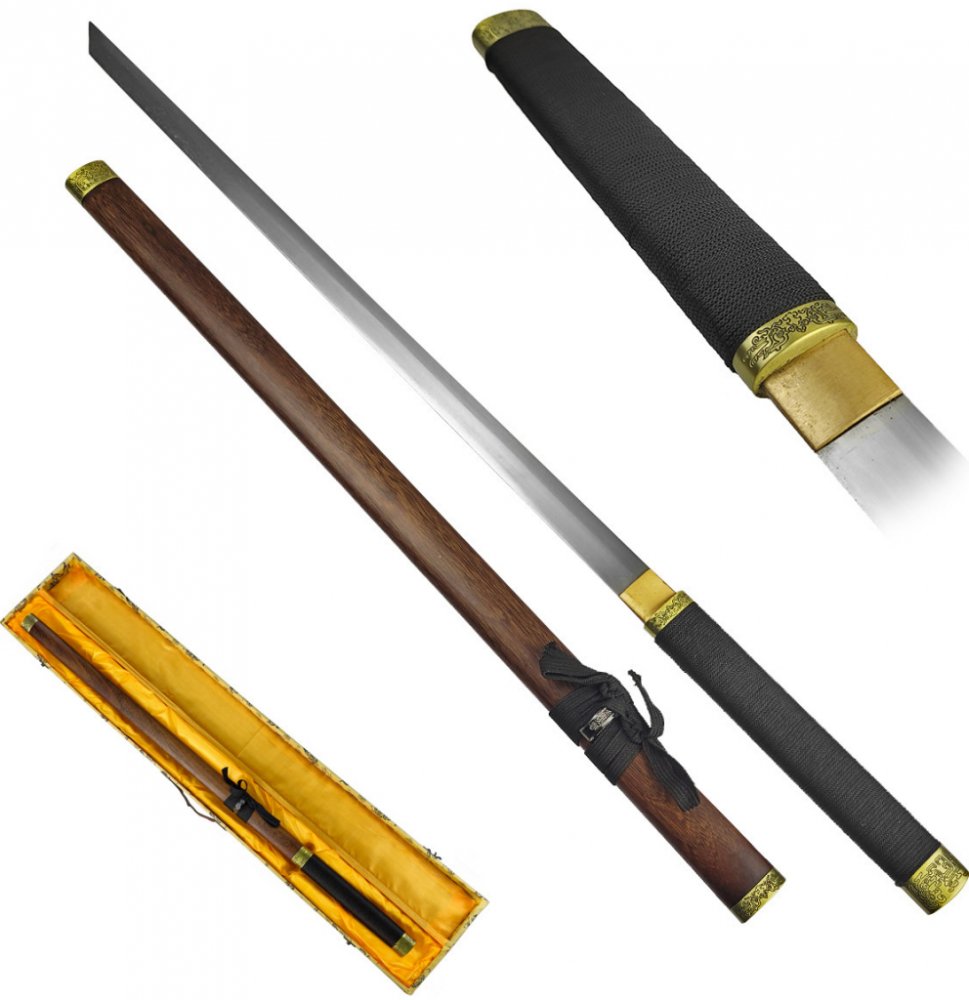 Rukojeť meče je omotána bavlněnou tkaninou, což zajišťuje dobře úchop a kontrolu nad mečem. Na meči najdete také krásné zdobné prvky z mosazi, které přidávají na jeho estetickou hodnotu. Meč je dodává s dřevěnou pochvou a černým hávem pro bezpečné přenášení. Tento meč je také balen v dřevěné dárkové krabici, což z něj představuje skvělý dárek pro milovníky bojových umění a historie.