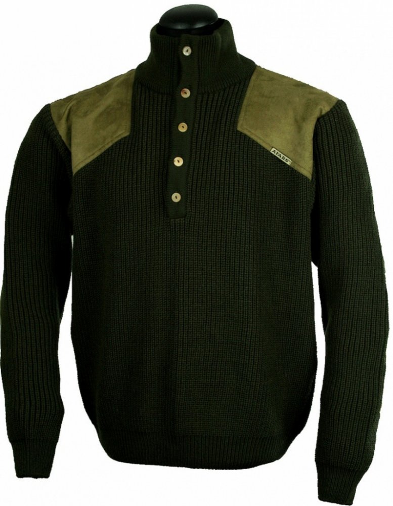 Silný lovecký svetr se zvýšeným límcem, zapínacím na knoflíčky z rohoviny. Lovecký svetr Arnošt má na ramenou a loktech našitou aplikaci z imitace kůže zelené barvy.