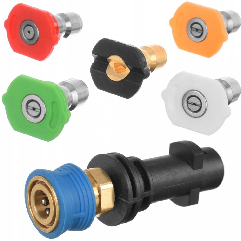 Sada mini pistole spolu s kompletem výměnných trysek s různým úhlem rozstřiku určených pro tlakové myčky řady K od firmy Karcher.